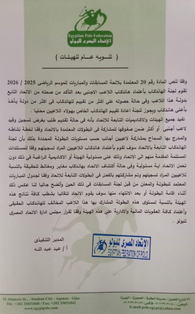 تنويه وتعميم لكافه الاندية الرياضية التابعة للاتحاد المصري للبولو February 2, 2026