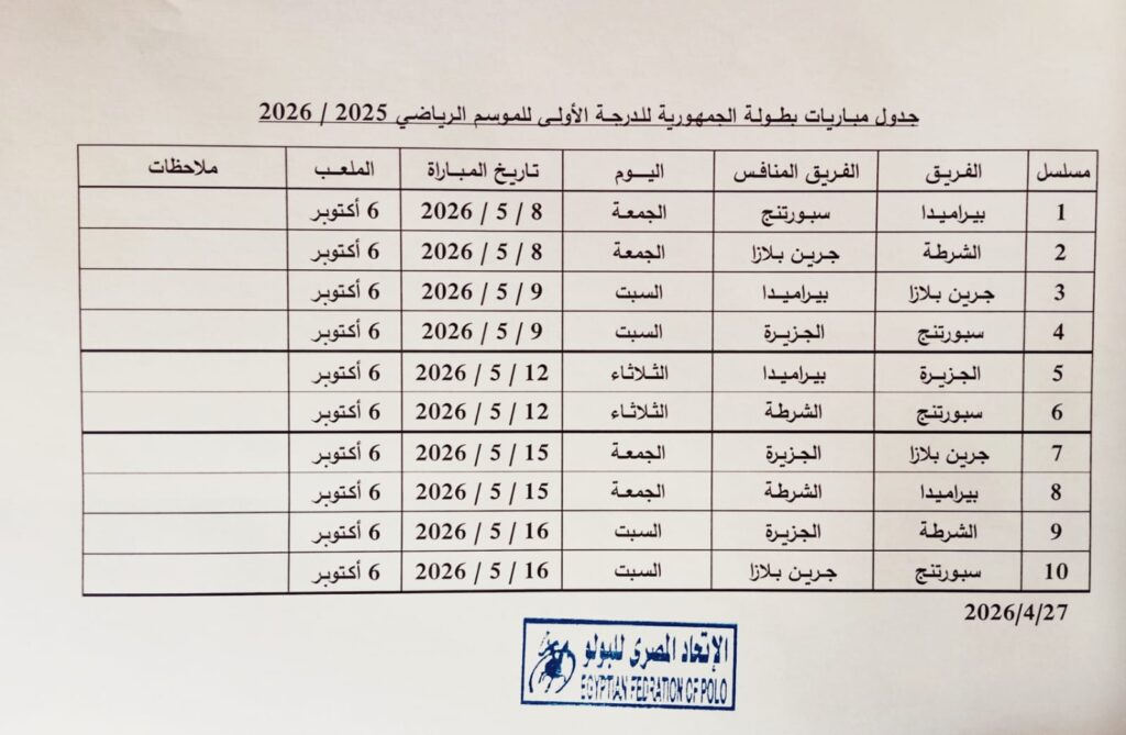تنويه وتعميم لكافه الاندية الرياضية التابعة للاتحاد المصري للبولو February 2, 2026